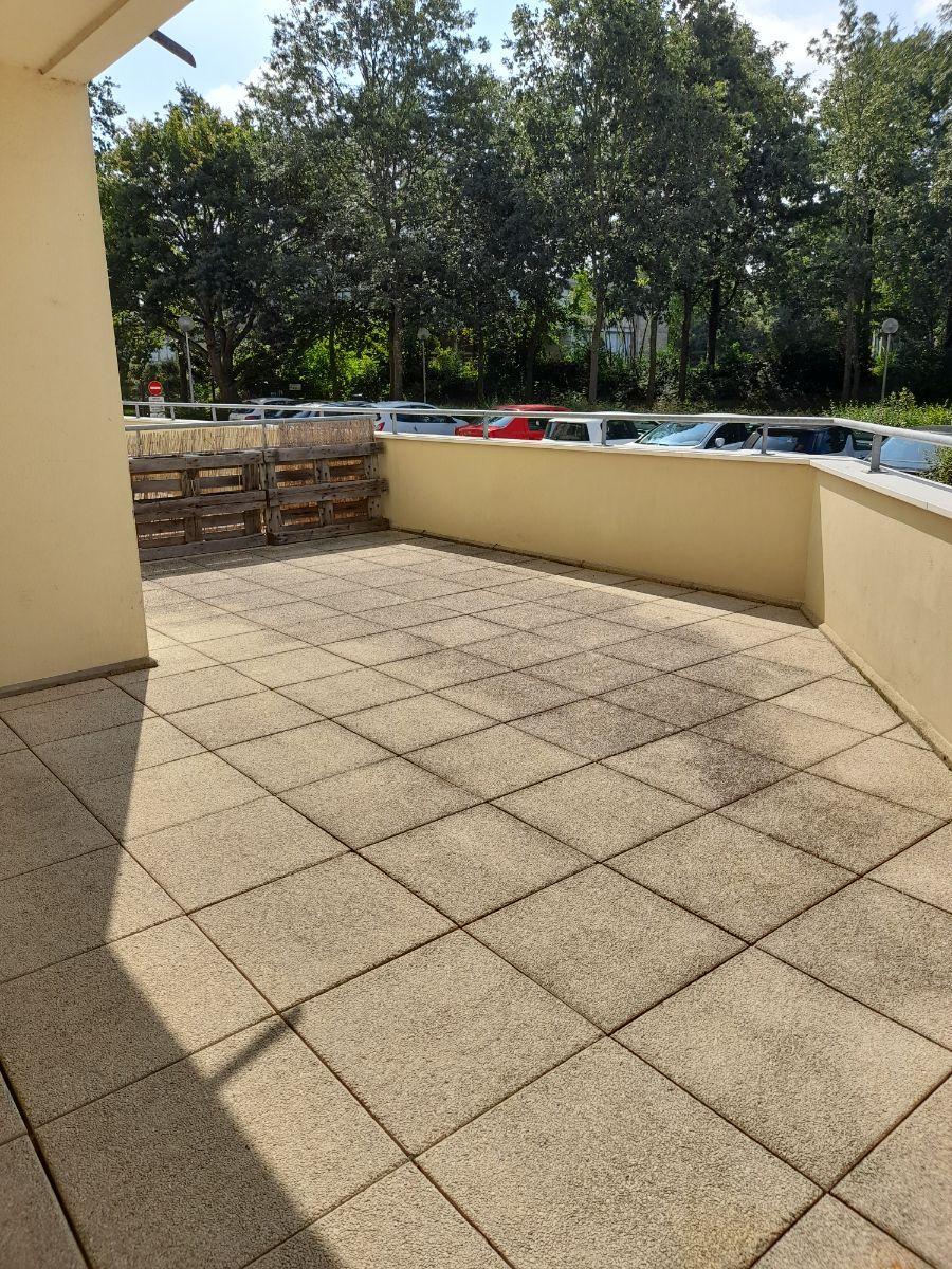 A RENNES, appartement typ2 avec terrasse, Quartier CLEUNAY-clinique de la Sagesse, appartement T, 49 m² hab en rez-de-chaussée surélevé avec grande terrasse sud et ouest de 33 m², comprenant : Entrée avec placards, wc, salle de bains, chambre, séjour 23 m² sur parquet flottant ouvrant au sud sur terrasse, cuisine ouverte. parking couvert. Réfection étanchéité toiture terrasse en cours.