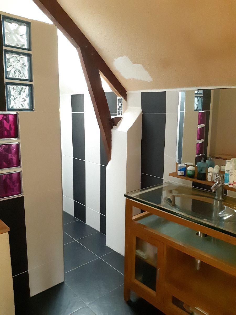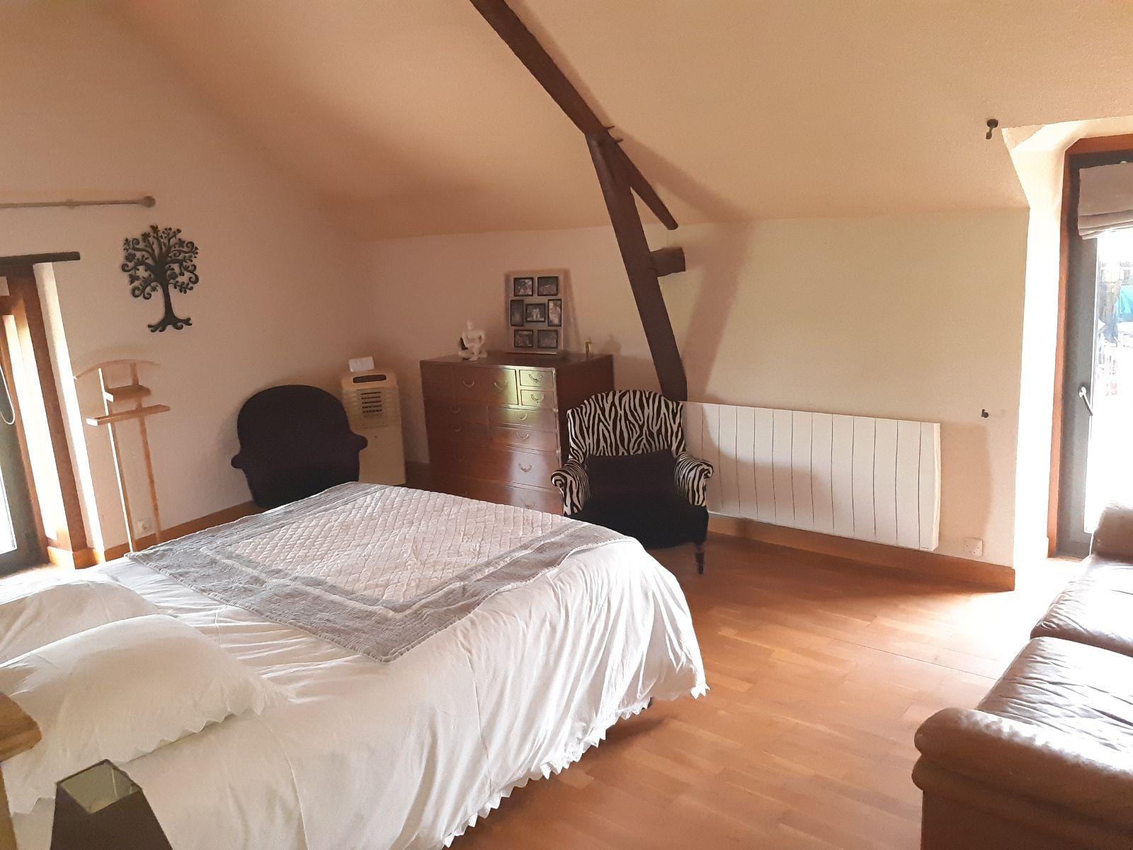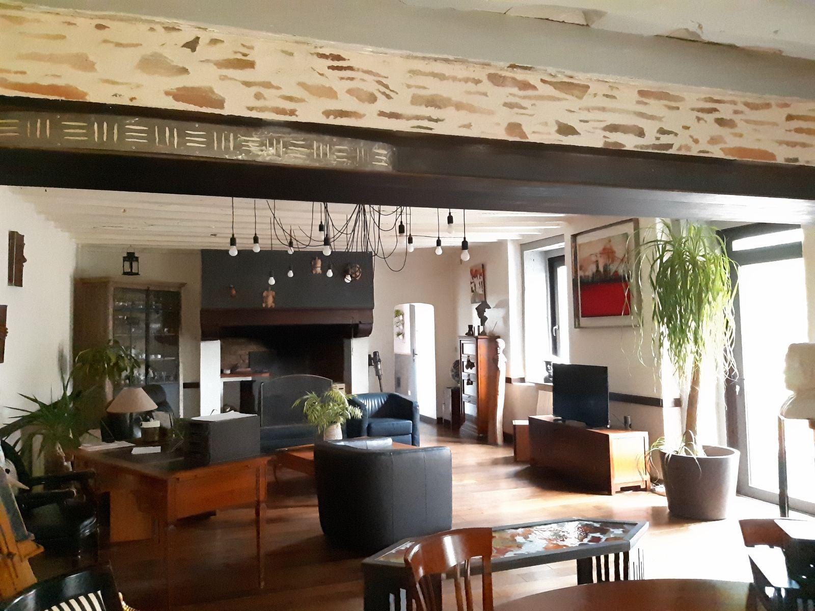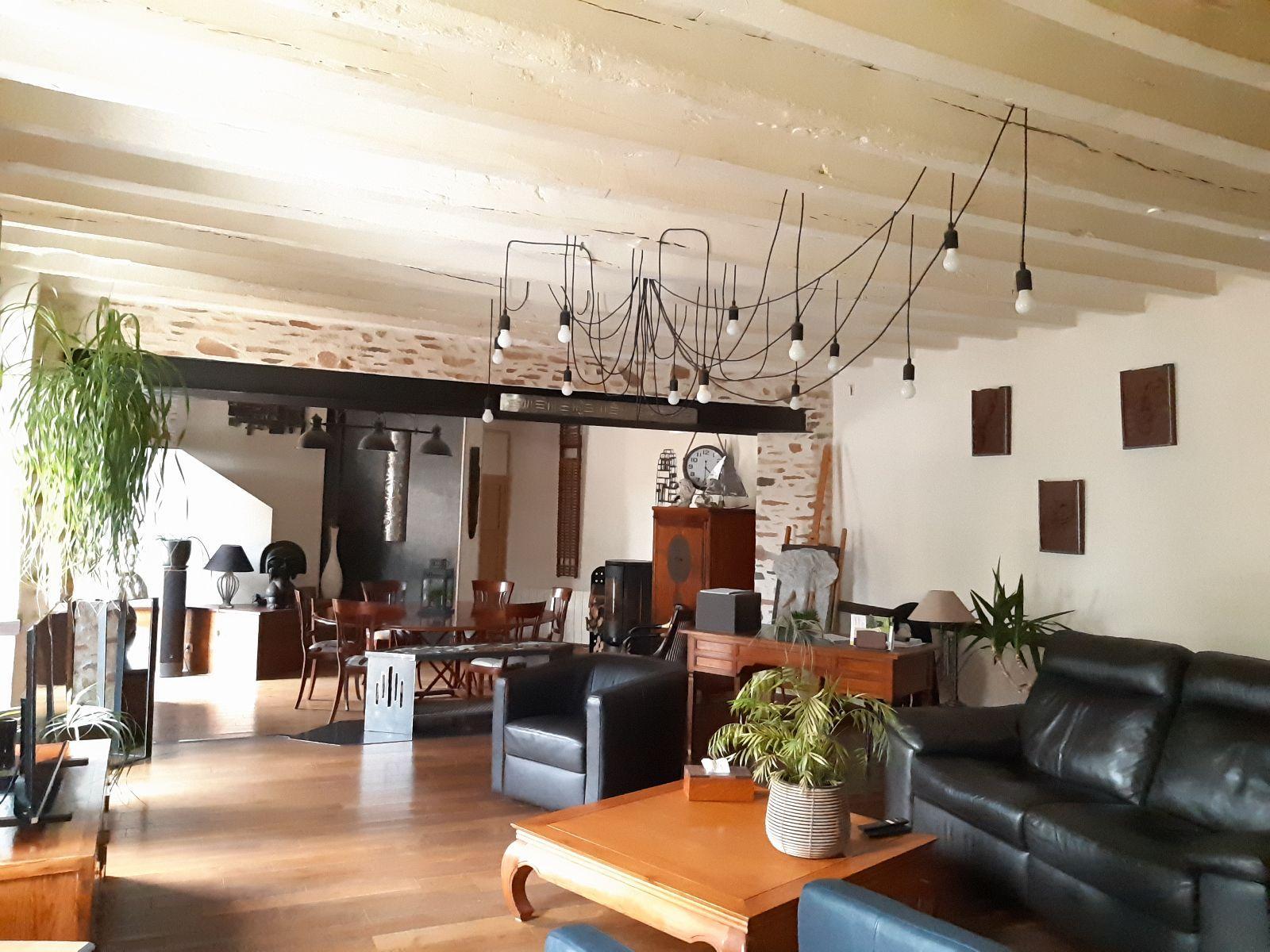 AU rez-de- chaussée au sud ouvrant sur une belle terrasse bois : Séjour-salon de 58 m² avec cheminée et poêle, cuisine aménagée et équipée ( hotte, plaques gaz, four, micro-onde, réfrigérateur), arrière cuisne, dégagement avec coin buanderie-lavabo, wc avec lave-mains, trois celliers ; A l’étage : couloir avec placards, chambre avec petit salon séparé par un verrière (couloir possibilité deux chambres), grande chambre avec placard et salle d’eau privative, wc, salle d’eau, deux chambres. Au pignon ouest de la maison, cellier de 30 m² au sol pouvant être aménagé en T2. (toiture ardoise refaite et isolée, mur chanvre et chaux, arrivée fosse septique. Grange et préau.